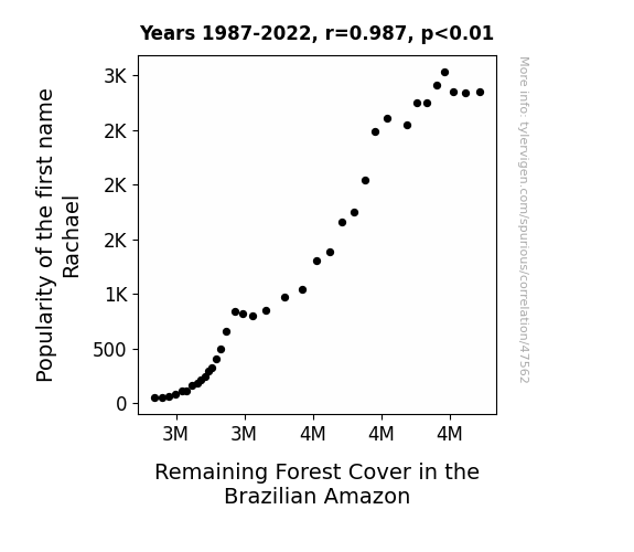 This means 97.4% of the change in the one variable (i.e., Remaining Forest Cover in the Brazilian Amazon) is predictable based on the change in the other (i.e., Popularity of the first name Rachael) over the 36 years from 1987 through 2022.