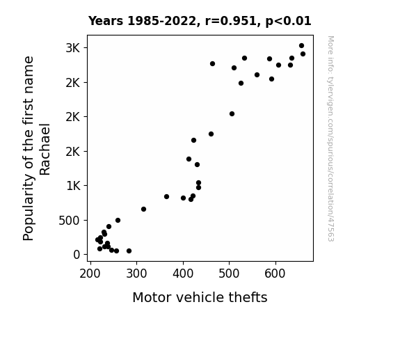 This means 90.5% of the change in the one variable (i.e., Motor vehicle thefts) is predictable based on the change in the other (i.e., Popularity of the first name Rachael) over the 38 years from 1985 through 2022.