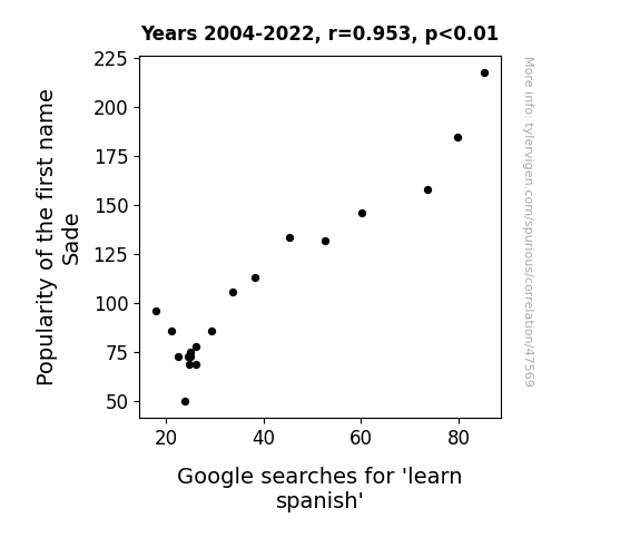 This means 90.9% of the change in the one variable (i.e., Google searches for 'learn spanish') is predictable based on the change in the other (i.e., Popularity of the first name Sade) over the 19 years from 2004 through 2022.