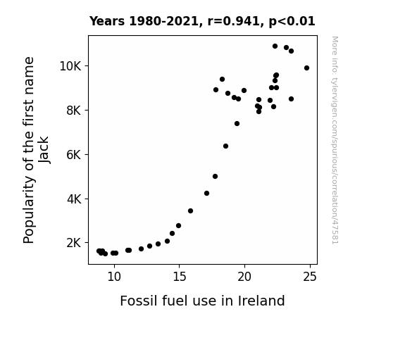 This means 88.6% of the change in the one variable (i.e., Fossil fuel use in Ireland) is predictable based on the change in the other (i.e., Popularity of the first name Jack) over the 42 years from 1980 through 2021.