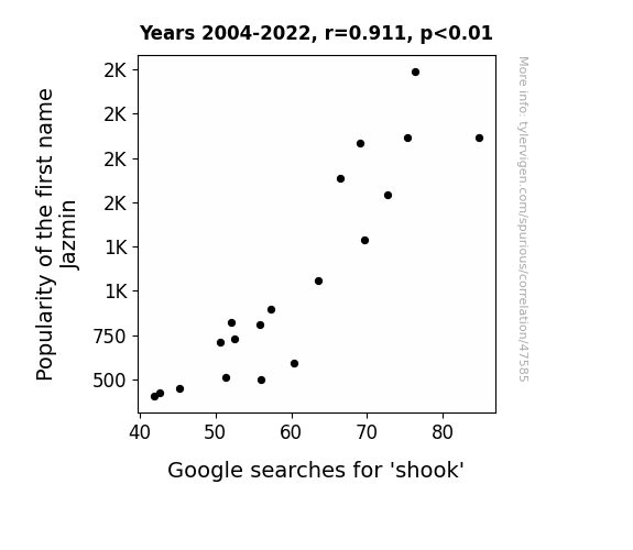 This means 82.9% of the change in the one variable (i.e., Google searches for 'shook') is predictable based on the change in the other (i.e., Popularity of the first name Jazmin) over the 19 years from 2004 through 2022.