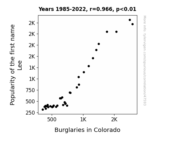 This means 93.3% of the change in the one variable (i.e., Burglaries in Colorado) is predictable based on the change in the other (i.e., Popularity of the first name Lee) over the 38 years from 1985 through 2022.