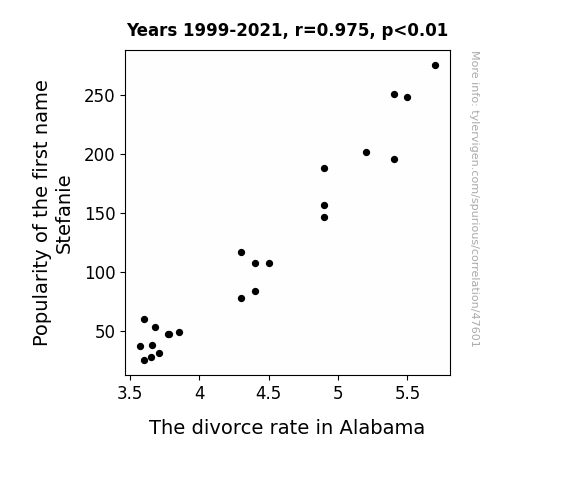 This means 95.2% of the change in the one variable (i.e., The divorce rate in Alabama) is predictable based on the change in the other (i.e., Popularity of the first name Stefanie) over the 23 years from 1999 through 2021.