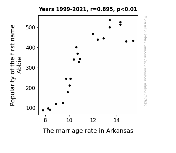 This means 80.1% of the change in the one variable (i.e., The marriage rate in Arkansas) is predictable based on the change in the other (i.e., Popularity of the first name Abbie) over the 23 years from 1999 through 2021.
