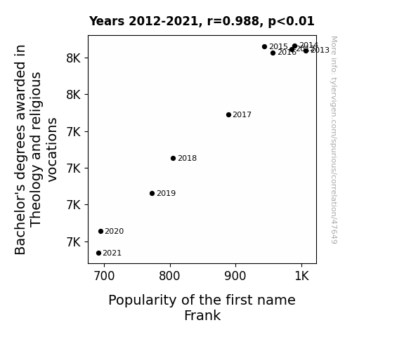 This means 97.5% of the change in the one variable (i.e., Popularity of the first name Frank) is predictable based on the change in the other (i.e., Bachelor's degrees awarded in Theology and religious vocations) over the 10 years from 2012 through 2021.