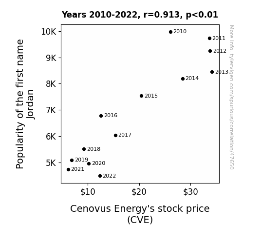 This means 83.3% of the change in the one variable (i.e., Cenovus Energy's stock price (CVE)) is predictable based on the change in the other (i.e., Popularity of the first name Jordan) over the 13 years from 2010 through 2022.