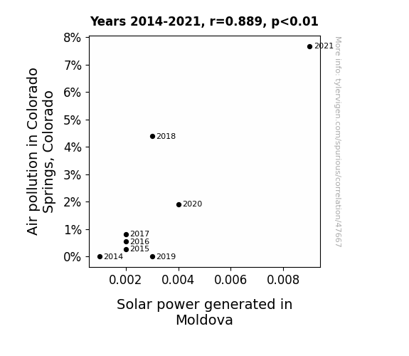 This means 79% of the change in the one variable (i.e., Solar power generated in Moldova) is predictable based on the change in the other (i.e., Air pollution in Colorado Springs, Colorado) over the 8 years from 2014 through 2021.