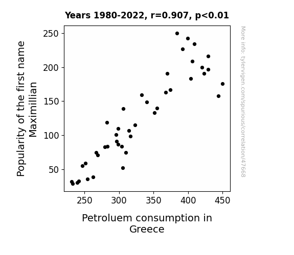 This means 82.2% of the change in the one variable (i.e., Petroluem consumption in Greece) is predictable based on the change in the other (i.e., Popularity of the first name Maximillian) over the 43 years from 1980 through 2022.