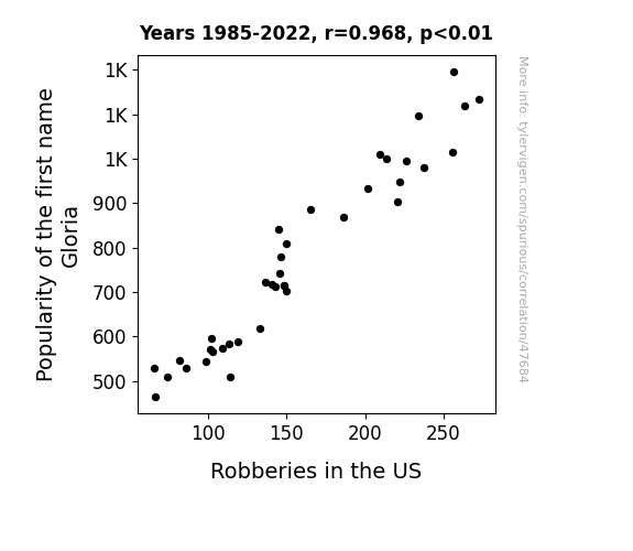 This means 93.8% of the change in the one variable (i.e., Robberies in the US) is predictable based on the change in the other (i.e., Popularity of the first name Gloria) over the 38 years from 1985 through 2022.
