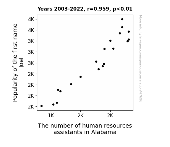 This means 92% of the change in the one variable (i.e., The number of human resources assistants in Alabama) is predictable based on the change in the other (i.e., Popularity of the first name Joel) over the 20 years from 2003 through 2022.