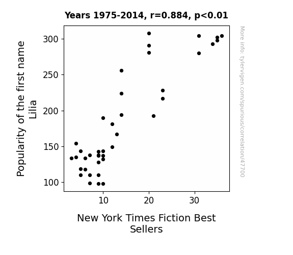 This means 78.2% of the change in the one variable (i.e., New York Times Fiction Best Sellers) is predictable based on the change in the other (i.e., Popularity of the first name Lilia) over the 40 years from 1975 through 2014.