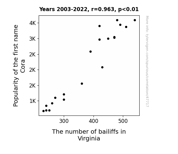 This means 92.7% of the change in the one variable (i.e., The number of bailiffs in Virginia) is predictable based on the change in the other (i.e., Popularity of the first name Cora) over the 20 years from 2003 through 2022.