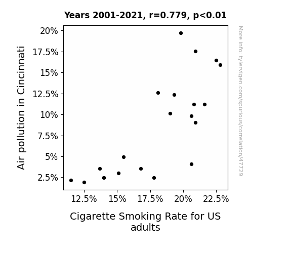 This means 60.7% of the change in the one variable (i.e., Cigarette Smoking Rate for US adults) is predictable based on the change in the other (i.e., Air pollution in Cincinnati) over the 21 years from 2001 through 2021.