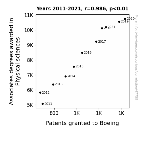 This means 97.3% of the change in the one variable (i.e., Patents granted to Boeing) is predictable based on the change in the other (i.e., Associates degrees awarded in Physical sciences) over the 11 years from 2011 through 2021.