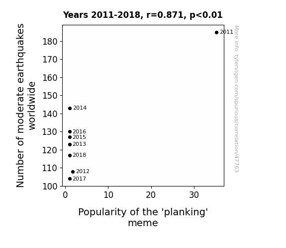 This means 75.8% of the change in the one variable (i.e., Popularity of the 'planking' meme) is predictable based on the change in the other (i.e., Number of moderate earthquakes worldwide) over the 8 years from 2011 through 2018.