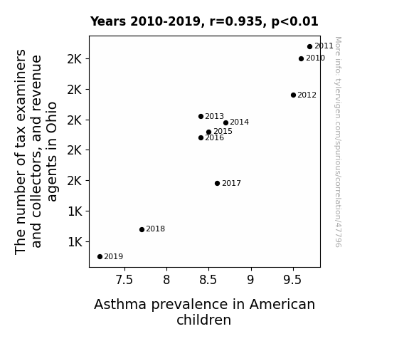 This means 87.5% of the change in the one variable (i.e., Asthma prevalence in American children) is predictable based on the change in the other (i.e., The number of tax examiners and collectors, and revenue agents in Ohio) over the 10 years from 2010 through 2019.