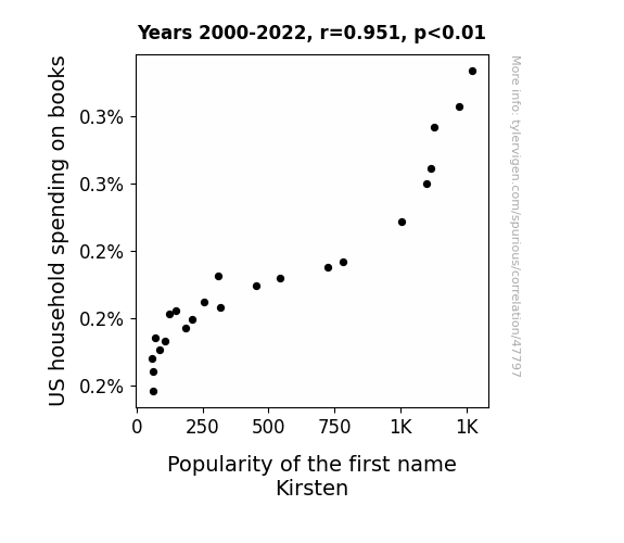 This means 90.5% of the change in the one variable (i.e., Popularity of the first name Kirsten) is predictable based on the change in the other (i.e., US household spending on books) over the 23 years from 2000 through 2022.