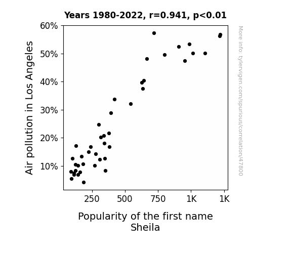 This means 88.5% of the change in the one variable (i.e., Popularity of the first name Sheila) is predictable based on the change in the other (i.e., Air pollution in Los Angeles) over the 43 years from 1980 through 2022.