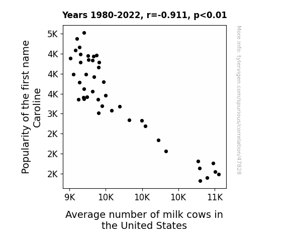 This means 83% of the change in the one variable (i.e., Average number of milk cows in the United States) is predictable based on the change in the other (i.e., Popularity of the first name Caroline) over the 43 years from 1980 through 2022.