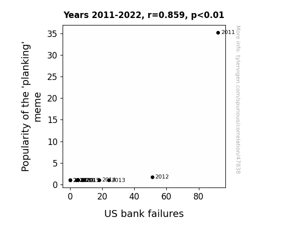 This means 73.7% of the change in the one variable (i.e., US bank failures) is predictable based on the change in the other (i.e., Popularity of the 'planking' meme) over the 12 years from 2011 through 2022.
