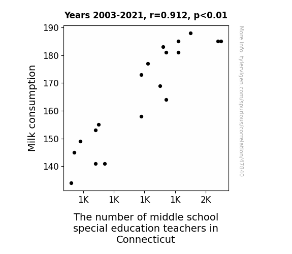 This means 83.2% of the change in the one variable (i.e., The number of middle school special education teachers in Connecticut) is predictable based on the change in the other (i.e., Milk consumption) over the 19 years from 2003 through 2021.