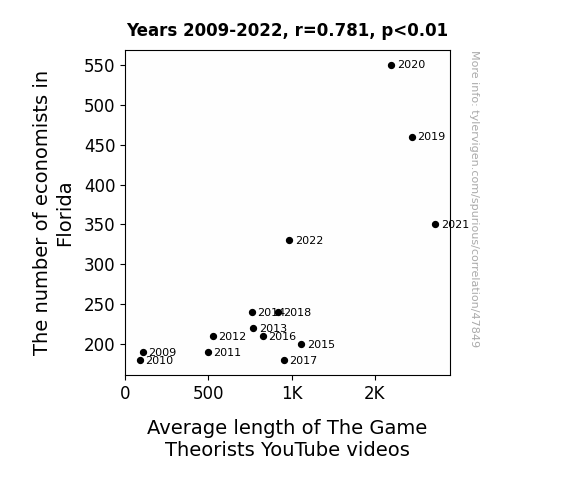 This means 61% of the change in the one variable (i.e., Average length of The Game Theorists YouTube videos) is predictable based on the change in the other (i.e., The number of economists in Florida) over the 14 years from 2009 through 2022.