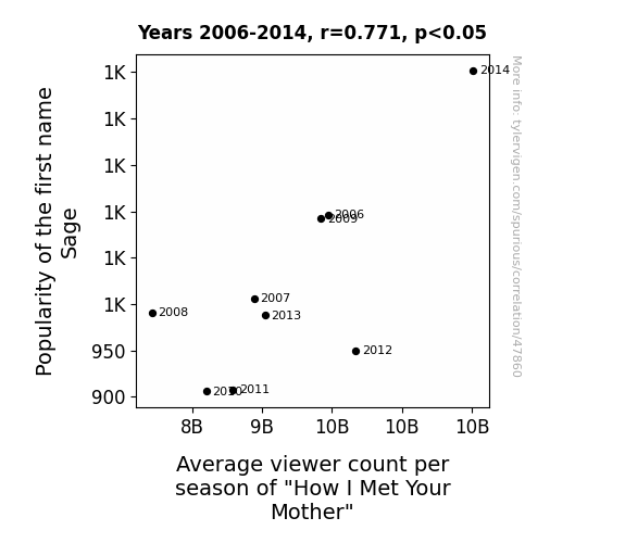 This means 59.4% of the change in the one variable (i.e., Average viewer count per season of "How I Met Your Mother") is predictable based on the change in the other (i.e., Popularity of the first name Sage) over the 9 years from 2006 through 2014.