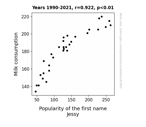 This means 84.9% of the change in the one variable (i.e., Popularity of the first name Jessy) is predictable based on the change in the other (i.e., Milk consumption) over the 32 years from 1990 through 2021.