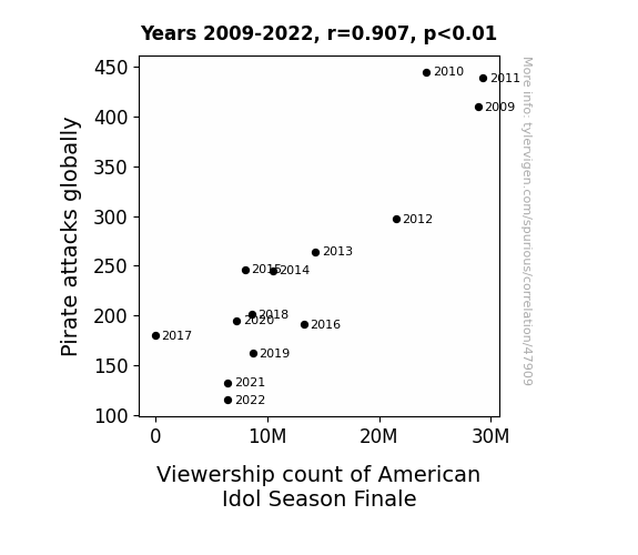 This means 82.2% of the change in the one variable (i.e., Viewership count of American Idol Season Finale) is predictable based on the change in the other (i.e., Pirate attacks globally) over the 14 years from 2009 through 2022.