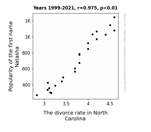 This means 95.1% of the change in the one variable (i.e., The divorce rate in North Carolina) is predictable based on the change in the other (i.e., Popularity of the first name Natasha) over the 23 years from 1999 through 2021.