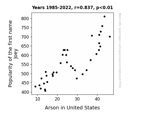 This means 70% of the change in the one variable (i.e., Arson in United States) is predictable based on the change in the other (i.e., Popularity of the first name Joey) over the 38 years from 1985 through 2022.