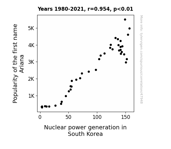 This means 91% of the change in the one variable (i.e., Nuclear power generation in South Korea) is predictable based on the change in the other (i.e., Popularity of the first name Ariana) over the 42 years from 1980 through 2021.