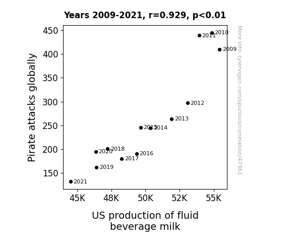 This means 86.3% of the change in the one variable (i.e., US production of fluid beverage milk) is predictable based on the change in the other (i.e., Pirate attacks globally) over the 13 years from 2009 through 2021.
