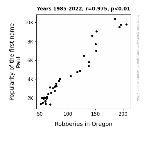 This means 95.1% of the change in the one variable (i.e., Robberies in Oregon) is predictable based on the change in the other (i.e., Popularity of the first name Paul) over the 38 years from 1985 through 2022.