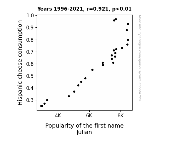 This means 84.9% of the change in the one variable (i.e., Popularity of the first name Julian) is predictable based on the change in the other (i.e., Hispanic cheese consumption) over the 26 years from 1996 through 2021.