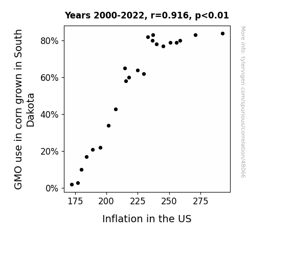 This means 84% of the change in the one variable (i.e., Inflation in the US) is predictable based on the change in the other (i.e., GMO use in corn grown in South Dakota) over the 23 years from 2000 through 2022.