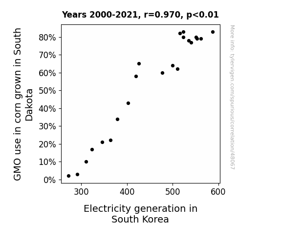 This means 94% of the change in the one variable (i.e., Electricity generation in South Korea) is predictable based on the change in the other (i.e., GMO use in corn grown in South Dakota) over the 22 years from 2000 through 2021.