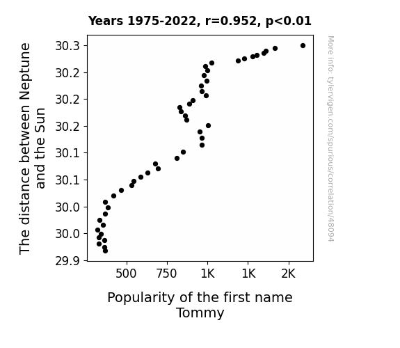 This means 90.7% of the change in the one variable (i.e., Popularity of the first name Tommy) is predictable based on the change in the other (i.e., The distance between Neptune and the Sun) over the 48 years from 1975 through 2022.