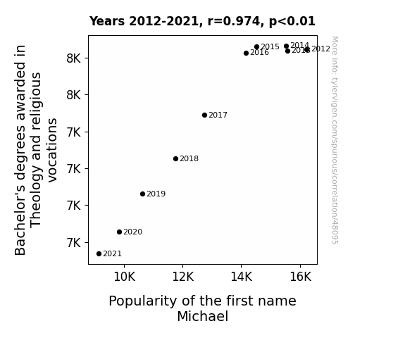 This means 94.9% of the change in the one variable (i.e., Popularity of the first name Michael) is predictable based on the change in the other (i.e., Bachelor's degrees awarded in Theology and religious vocations) over the 10 years from 2012 through 2021.