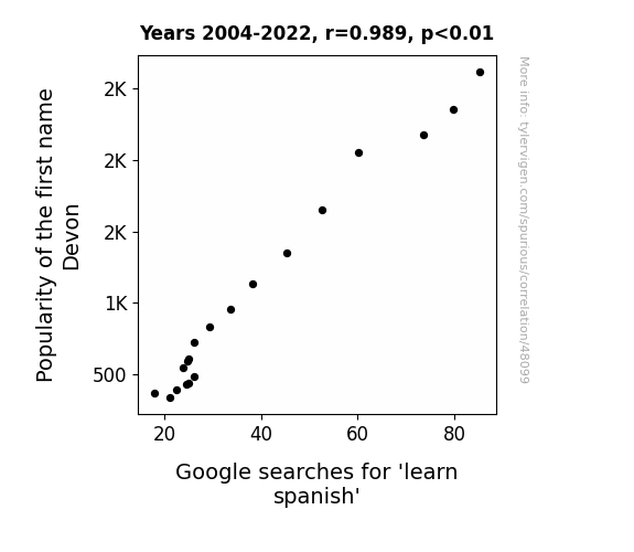 This means 97.8% of the change in the one variable (i.e., Google searches for 'learn spanish') is predictable based on the change in the other (i.e., Popularity of the first name Devon) over the 19 years from 2004 through 2022.