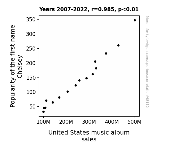 This means 97% of the change in the one variable (i.e., United States music album sales) is predictable based on the change in the other (i.e., Popularity of the first name Chelsey) over the 16 years from 2007 through 2022.