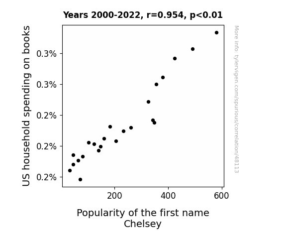 This means 91.1% of the change in the one variable (i.e., Popularity of the first name Chelsey) is predictable based on the change in the other (i.e., US household spending on books) over the 23 years from 2000 through 2022.