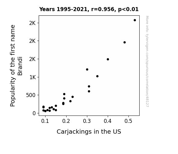 This means 91.3% of the change in the one variable (i.e., Carjackings in the US) is predictable based on the change in the other (i.e., Popularity of the first name Brandi) over the 27 years from 1995 through 2021.