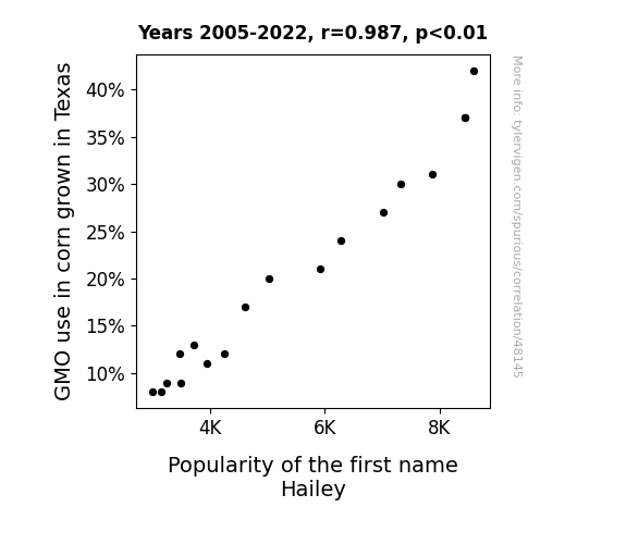 This means 97.3% of the change in the one variable (i.e., Popularity of the first name Hailey) is predictable based on the change in the other (i.e., GMO use in corn grown in Texas) over the 18 years from 2005 through 2022.