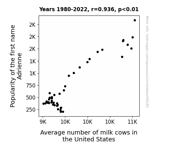 This means 87.6% of the change in the one variable (i.e., Average number of milk cows in the United States) is predictable based on the change in the other (i.e., Popularity of the first name Adrienne) over the 43 years from 1980 through 2022.