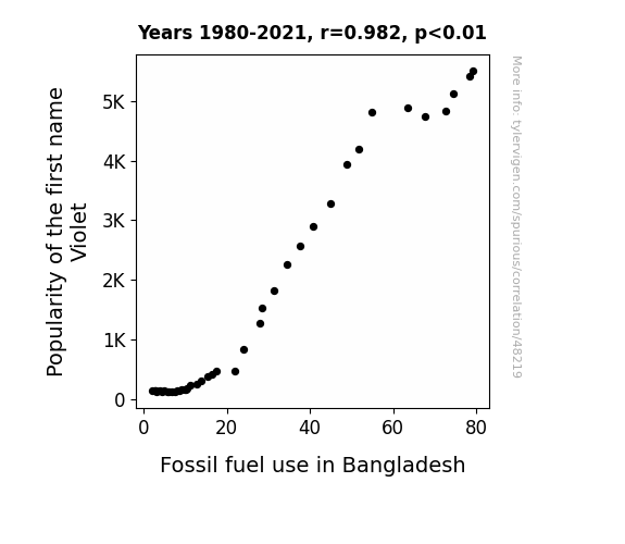 This means 96.5% of the change in the one variable (i.e., Fossil fuel use in Bangladesh) is predictable based on the change in the other (i.e., Popularity of the first name Violet) over the 42 years from 1980 through 2021.