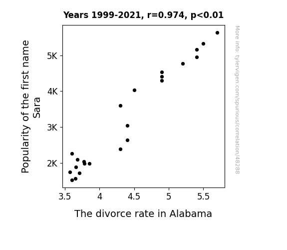 This means 94.9% of the change in the one variable (i.e., The divorce rate in Alabama) is predictable based on the change in the other (i.e., Popularity of the first name Sara) over the 23 years from 1999 through 2021.