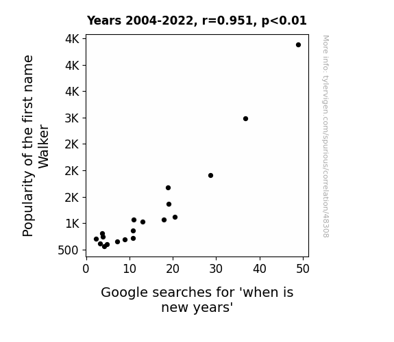 This means 90.5% of the change in the one variable (i.e., Google searches for 'when is new years') is predictable based on the change in the other (i.e., Popularity of the first name Walker) over the 19 years from 2004 through 2022.