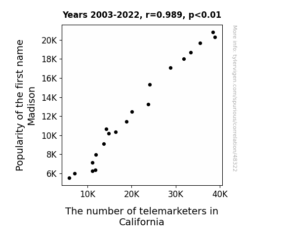 This means 97.7% of the change in the one variable (i.e., The number of telemarketers in California) is predictable based on the change in the other (i.e., Popularity of the first name Madison) over the 20 years from 2003 through 2022.