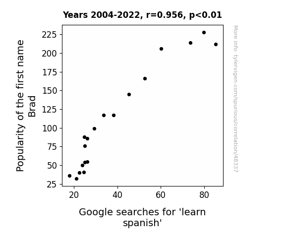 This means 91.4% of the change in the one variable (i.e., Google searches for 'learn spanish') is predictable based on the change in the other (i.e., Popularity of the first name Brad) over the 19 years from 2004 through 2022.